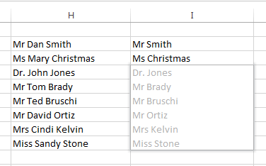 As we start complete this task in column I by typing, “Mr. Smith” and then move on to filling in “Ms. Christmas”, Flash Fill calculates the contents of the remaining cells in our table based on the contents in Column H.